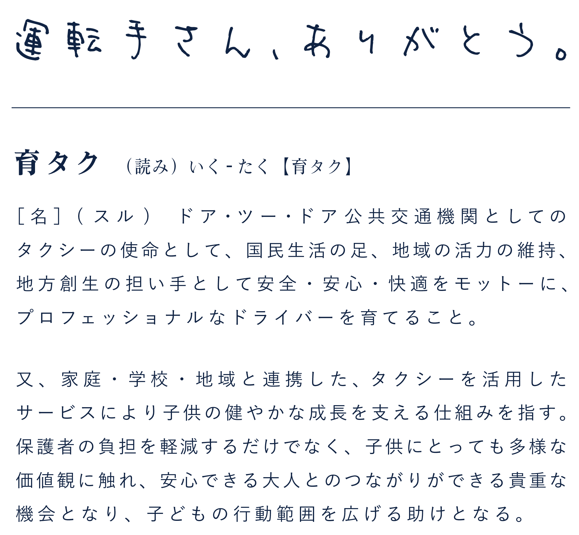今年のテーマは「子供とタクシードライバー」。公共交通機関と子供との関係は、安全・教育・地域とのつながりといった多面的な観点からとても重要です。地域社会で子供を育てる取り組みは、「地域ぐるみの子育て」や「地域共育(きょういく)」と呼ばれます。
